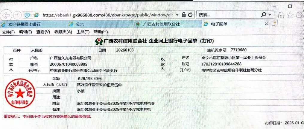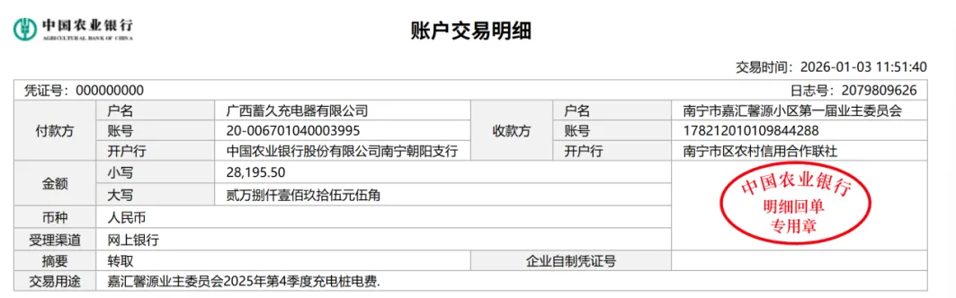 (二)2026年1月3日,核实小区电动自行车充电桩运营商转入2025年第四季度营收分成,公共收益收入28195.50元(含电费支出)。