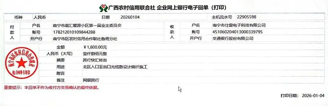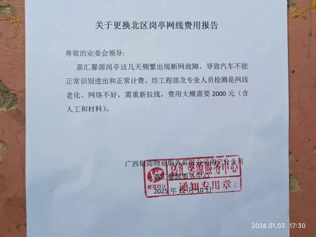 (三)2026年1月4日,核实物业公司提交的关于更换北区岗亭网线费用报告,公共收益支出1800元。