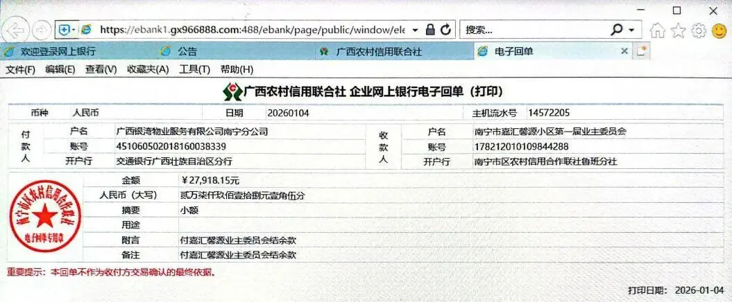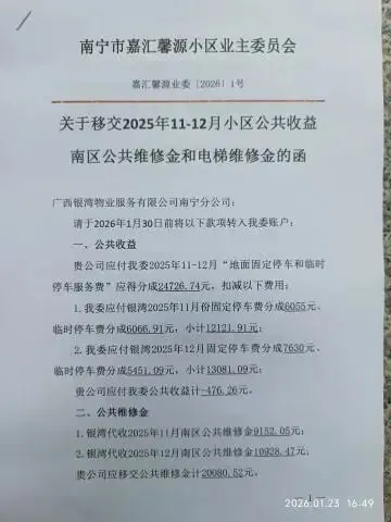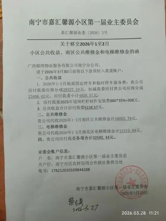 (十九)2026年3月27日,向银湾物业公司递交请款函,要求移交2026年1至2月公共收益分成、南区公维金和电梯费共计52592.44元。