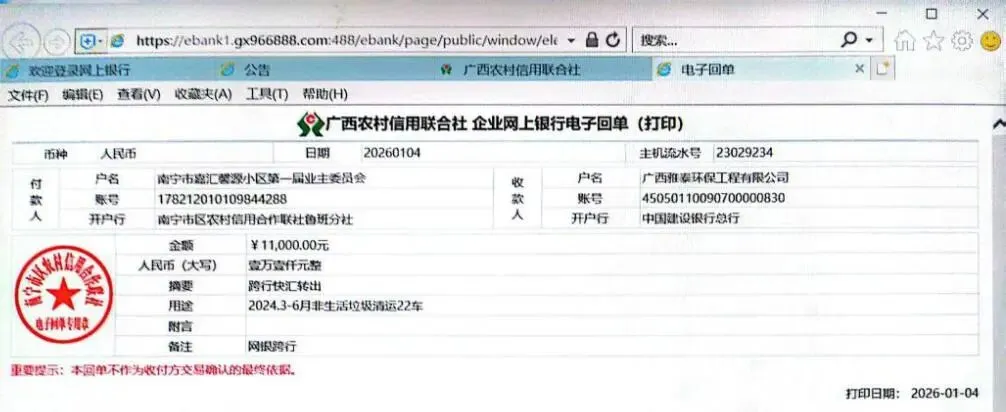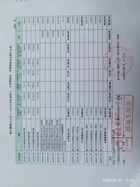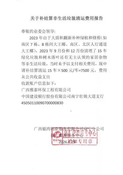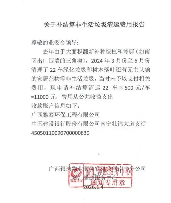 (五)2026年1月4日,核算物业公司移交的关于补结算2024年3月至6月非生活垃圾费用申请报告,公共收益支出11000元。