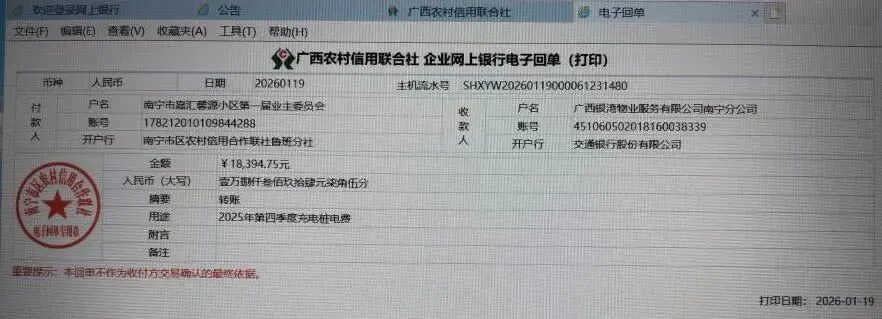 (六)2026年1月19日,审核物业公司提交的关于结算2025年第四季度电动自行车充电用电费用报告,公共收益支出18394.75元。