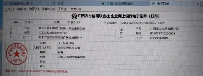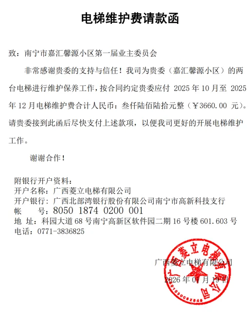 (七)2026年1月19日,核实菱立电梯公司提交的关于支付18号楼2台旧电梯2025年第四季度维护费的请款函,电梯维修金支出3660元。
