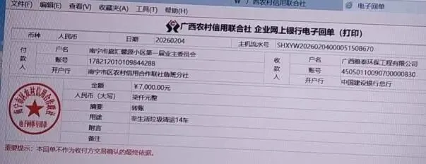 (九)2026年2月4日,审核物业公司提交的关于结算应付未付2023年9月至2023年12月清运非生活垃圾14车费用的请款函,公共收益支出7000元。