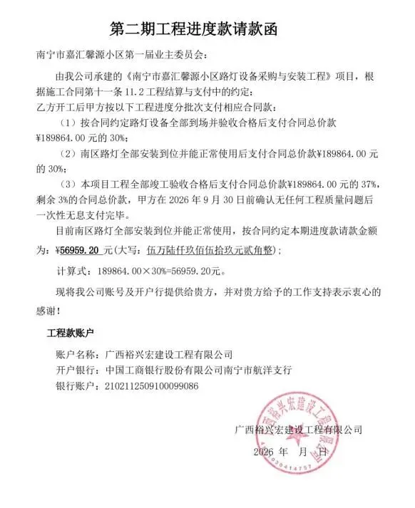 (八)2026年1月27日,审核路灯安装工程施工方提交关于支付按工程进度结算总合同价款30%的请款函,公共收益支出56959.20元。