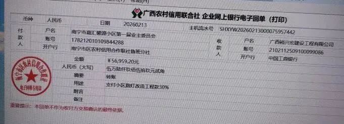 (十)2026年2月13日,审核路灯安装工程施工方提交关于支付按工程进度结算总合同价款30%的请款函,公共收益支出56959.20元。