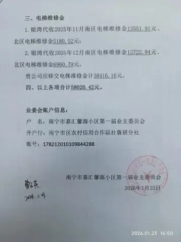 (四)2026年1月4日,核算物业公司应收、未收2023年和2024年电梯费和南区公共维修金,合计结算27918.15元。