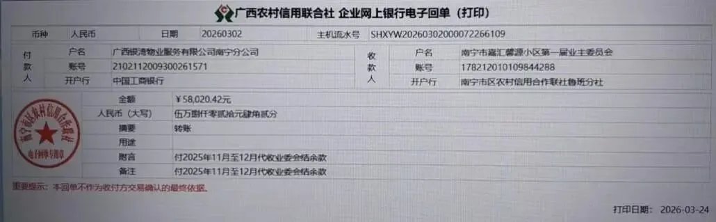 (十一)2026年3月3日,发函物业公司签收关于移交2025年11-12月公共收益分成和代收的南区公共维修金及电梯维修金三项合计58020.42元。