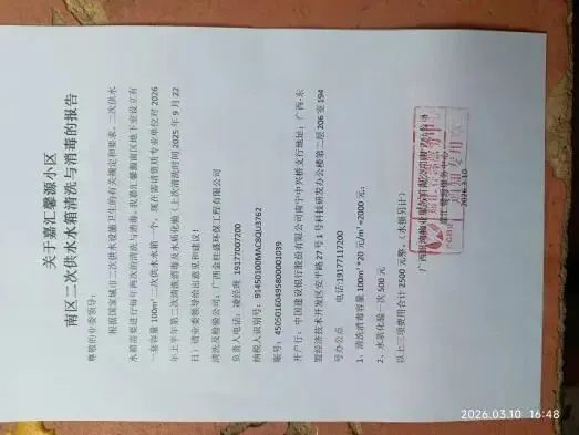(七)2026年3月17日,南区二次供水水箱半年一洗期间,业委配合物业全程跟进相关清洗和消毒工作。