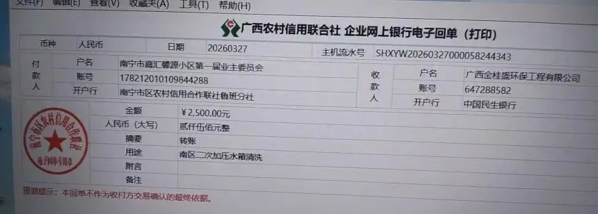 (十三)2026年3月27日,核实物业公司提交的关于清洗南区二次供水水箱报告,向金桂图环保公司转出清洗南区二次供水水箱费用贰仟伍佰元(¥2500,含消毒与水质检测)。