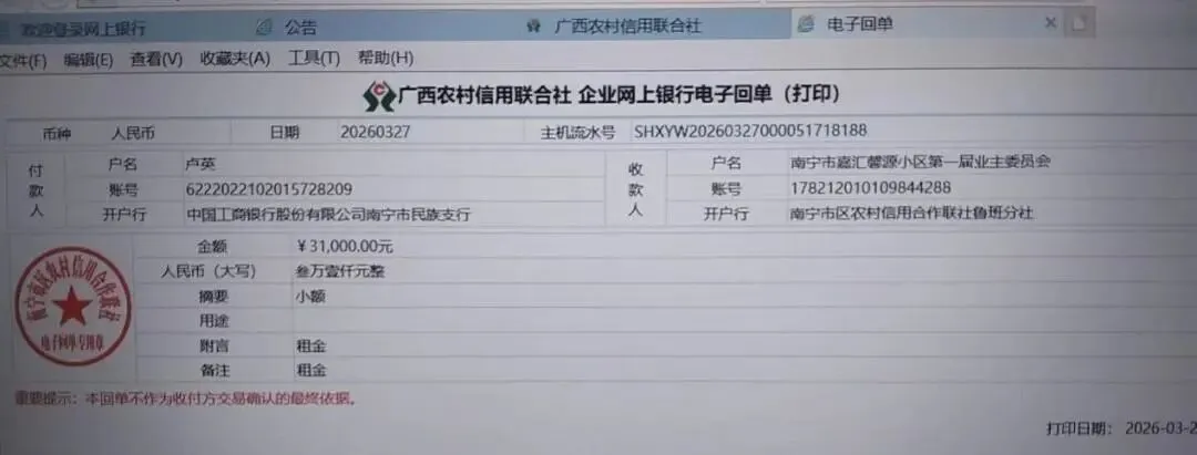 (十四)2026年3月27日,核实游泳池租赁承包项目中标方转入第一年场地占用费叁万壹仟元(¥31000)到账。