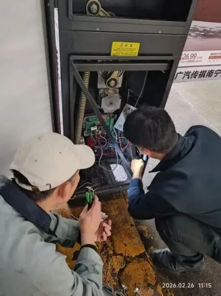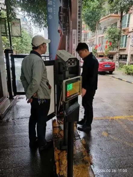 (五)2026年2月26日,跟进车辆收费设备维护方处理道闸故障现场,最近一段时间以来,南区大门岗闸杆发生不明原因的频繁升降现象,对车辆进出安全非常不利,更换主板后恢复正常。