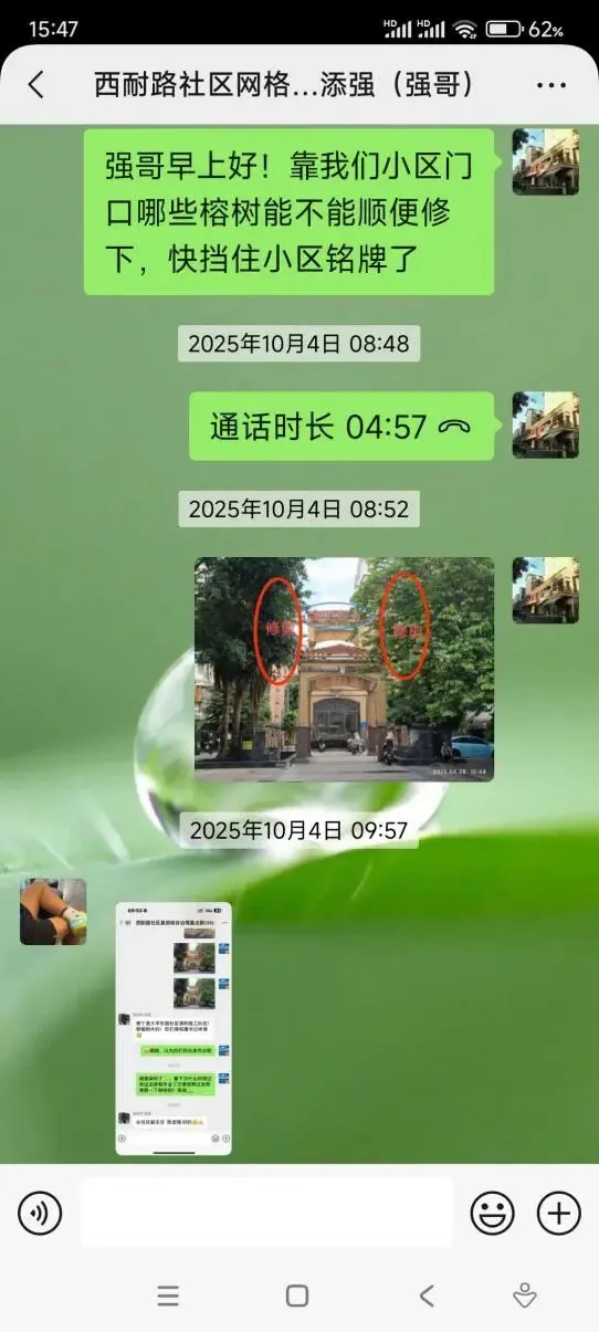 (三)2026年1月17日,持续与西耐路社区网格员沟通北区17岗大门外树木遮挡门楼上的“嘉汇馨源”标识事宜,对相关树木进行了修剪。