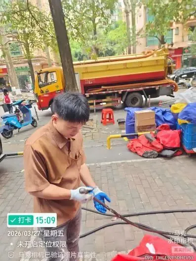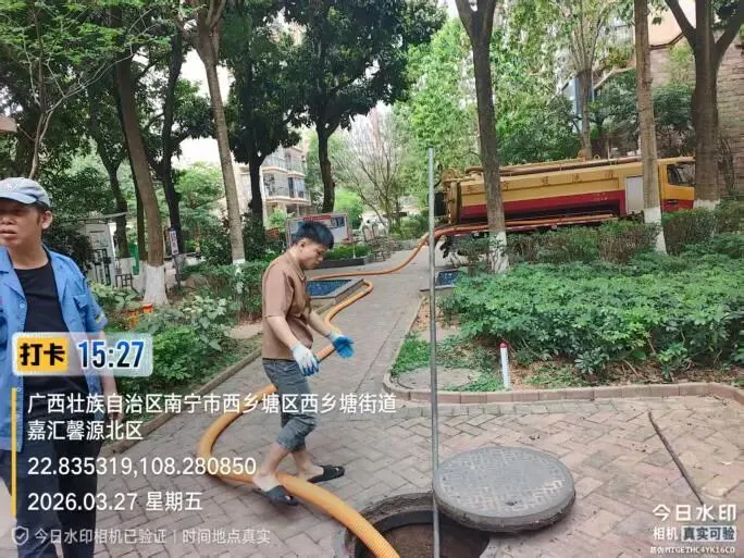 (八)2026年3月27日,跟进抽污作业车疏通20栋公共排污管暨抽取15栋化粪池满溢现场。