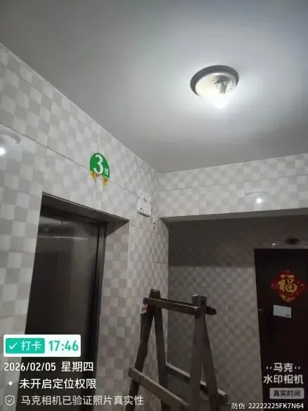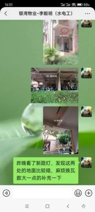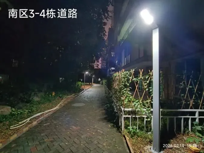 (五)2026年2月14日,巡查南区新路灯发现8号楼B座靠3号楼一侧以及7号楼B座南面道路灯光不足,督促物业电工更换瓦数相对较大(40瓦)的球型灯泡进行补光。