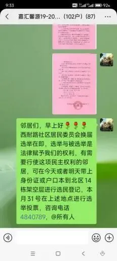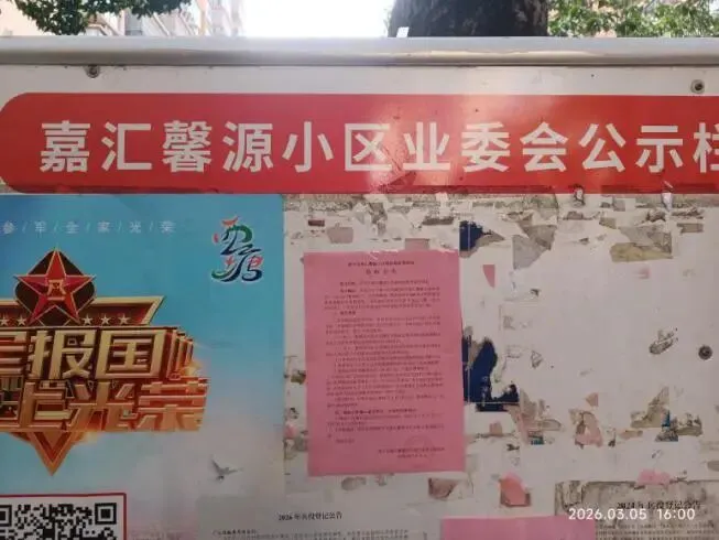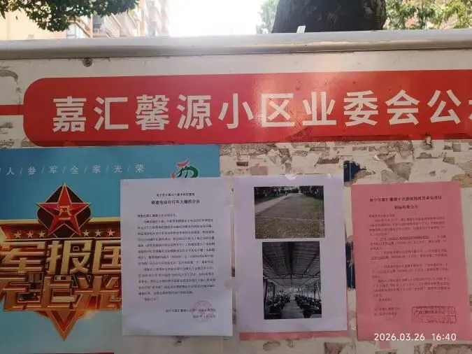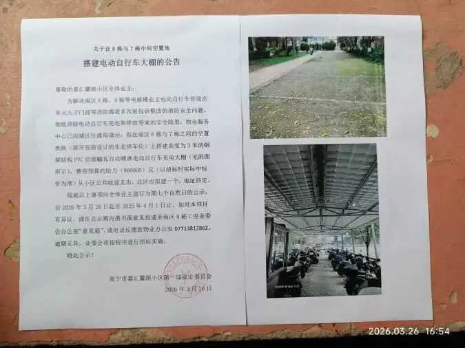 (十八)2026年3月26日,在小区公示栏张贴《关于拟建电动自行车大棚的公告》,相关信息同步转发至14个业主微信群。
