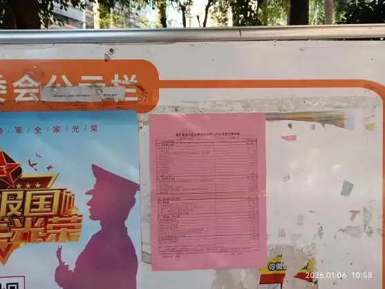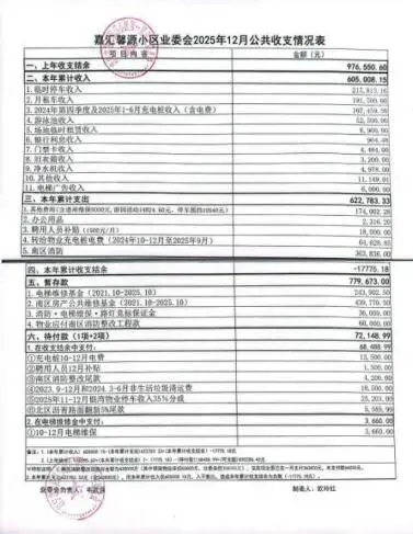 (四)2026年1月6日,在小区公示栏张贴《嘉汇馨源小区业委会2025年12月公共收支情况表》,相关信息同步转发至14个业主微信群。