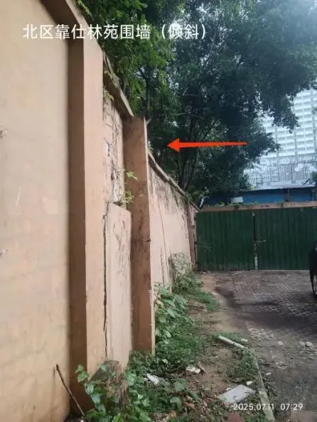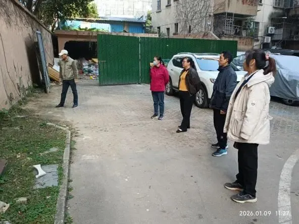 (八)2026年1月9日,配合物业服务中心与西耐路社区工作人员会同隔壁小区“仕林苑”业委在倾斜已久的北区围墙现场共商解决方案。