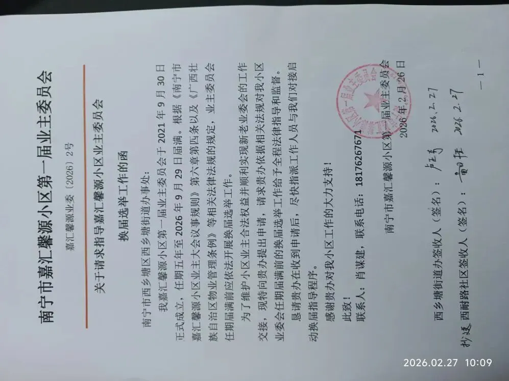 (十二)2026年2月27日,向街道办和社区递交关于申请指导业委会任期届满需要换届选举的工作函,为即将进行的换届筹备提前准备。