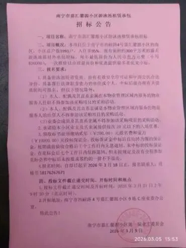 (十三)2026年3月5日,在小区公示栏张贴《嘉汇馨源小区游泳池租赁承包项目招标公告》,相关信息同步转发至14个业主微信群。