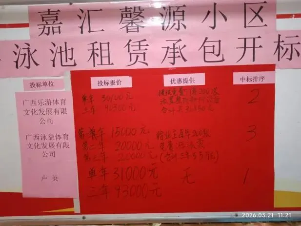(十五)2026年3月17日,接待前来考察小区游泳池设备设施以及招标情况的体育业内人士。房地产开发以来,随着新建小区(游泳池)数量的急剧增加和人口出生率不断下降的矛盾,目前游泳池经营趋于下行态势。我们小区的周边,如广西大学、城市碧园、天健城和文华园等都有规模不一、档次不同的游泳池,出租前景很不乐观。