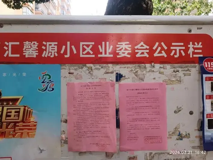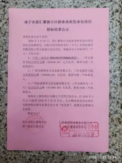 (十七)2026年3月21日下午,在小区公示栏张贴《嘉汇馨源小区游泳池租赁承包项目招标结果公示》,相关信息同步转发至14个业主微信群。