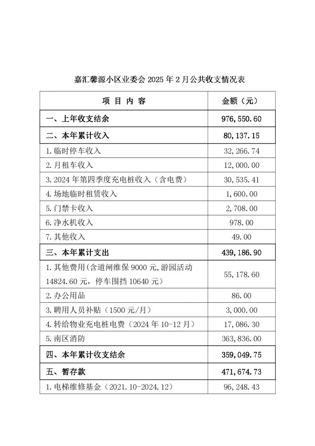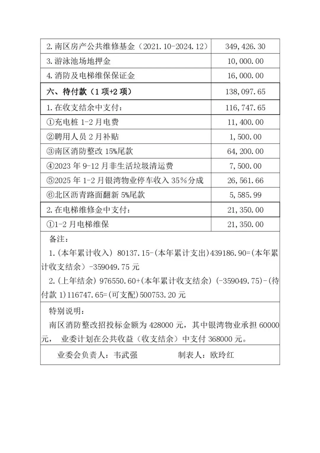 (一)截止2025年2月份,小区公共收支结余可支配款为 : 500753.20元,详见下表: