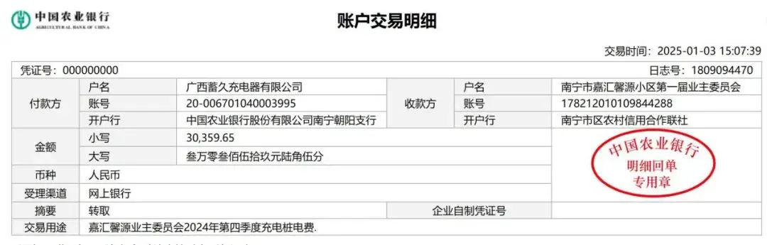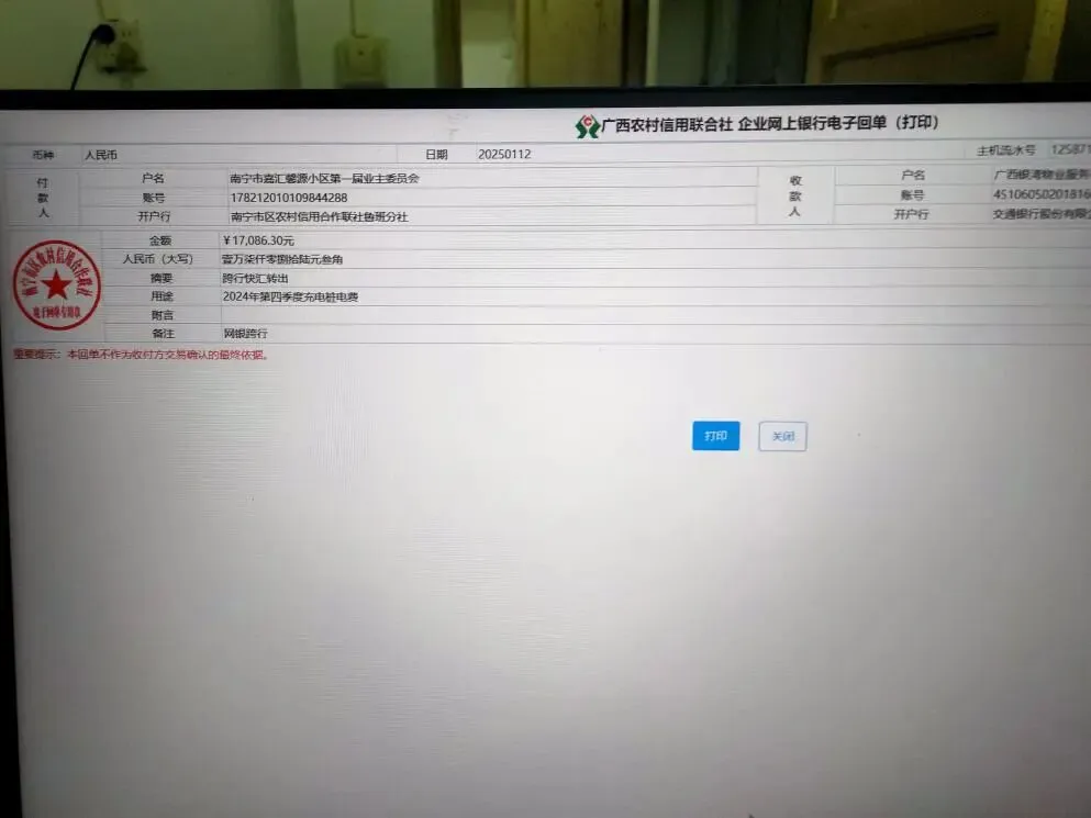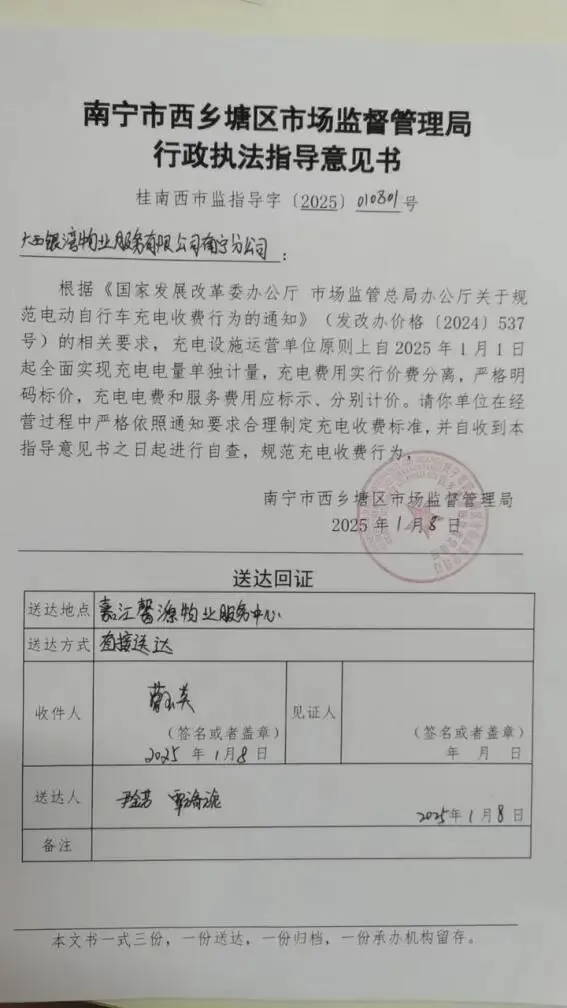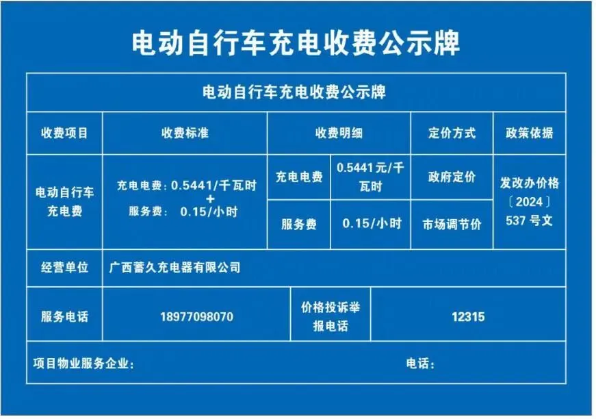 (七)2025年1月8日,根据物业服务中心签收的《南宁市西乡塘区市场监督管理局行政执法指导意见书》,为规范电动自行车充电收费(电费+服务费分别计价),经栋长群讨论并与承包商沟通决定暂时按0.5441元/千瓦时+0.15元/小时的单价收取充电费用。