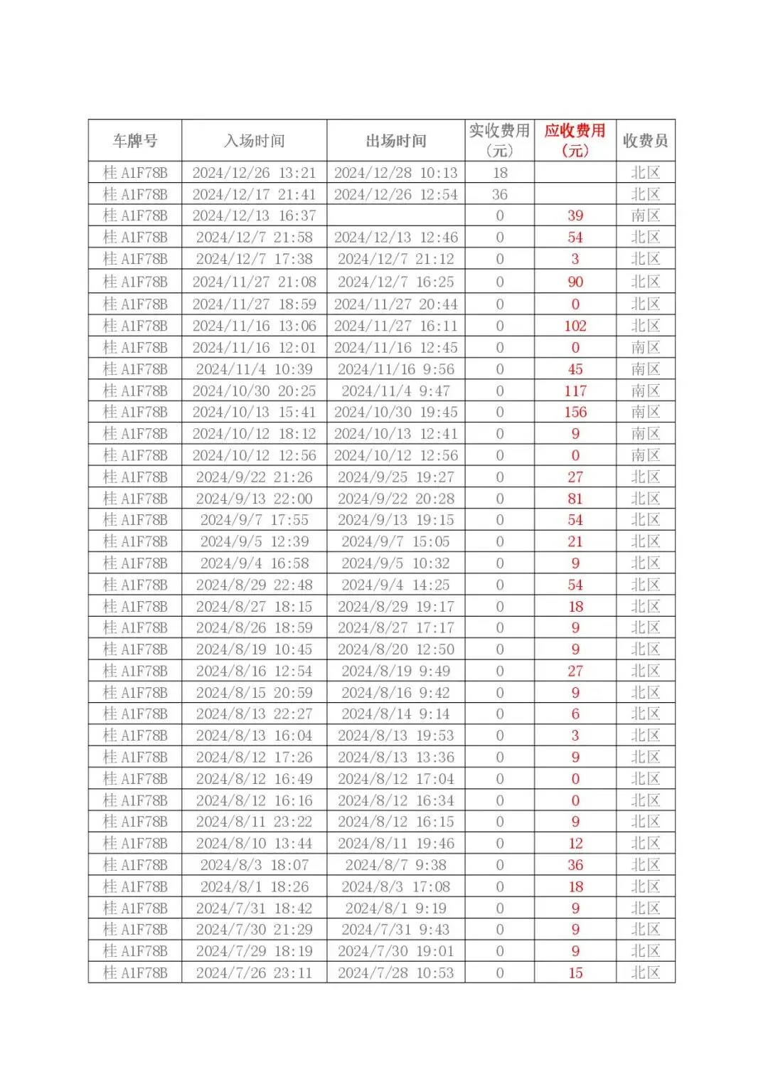 (四)2025年1月9日,协助物业核查月卡临时车桂A1F78B自2024年6月15日至2024年12月20日进出场应交未交临时停车费用,挽回部分公共收益。