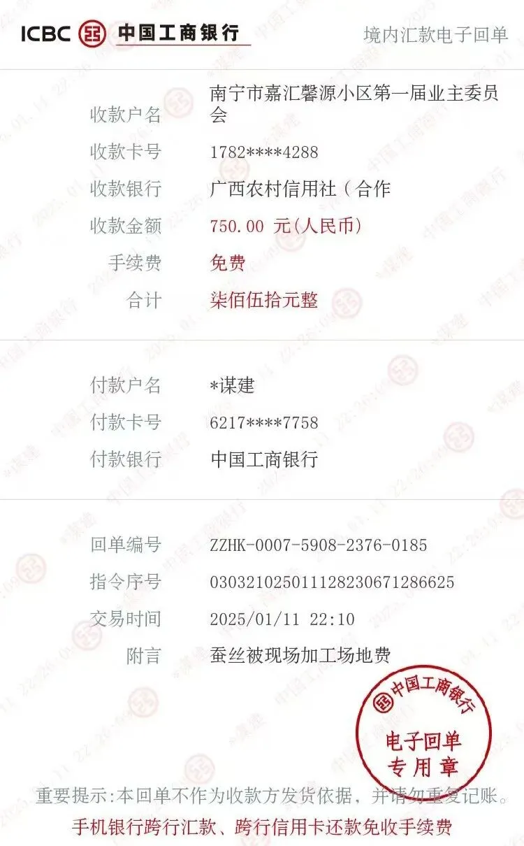 ★(五)2025年1月11日,代转蚕丝被现场制作场地占用费,公共收益增收¥750.00元。