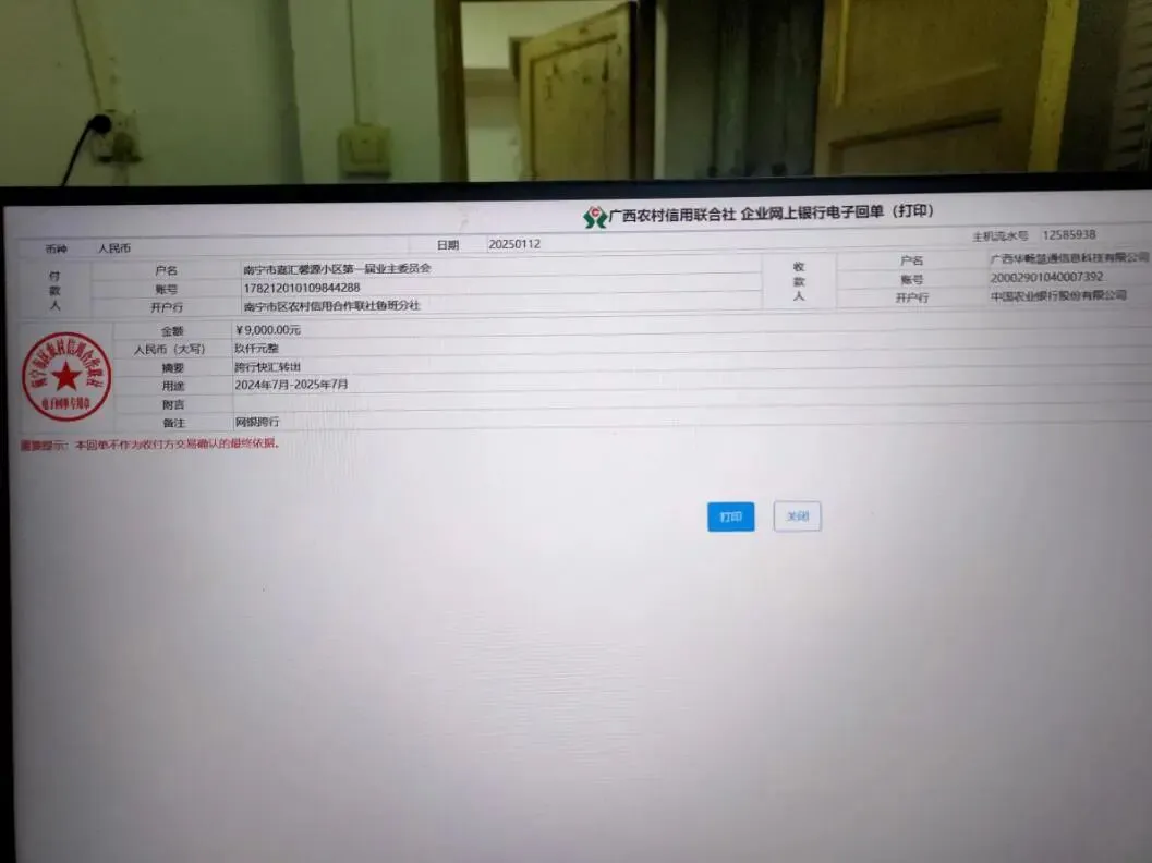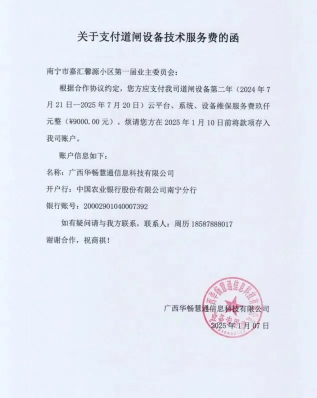 ☆(六)2025年1月12日,核实道闸停车收费系统维护方(华畅)提交的《关于支付道闸设备技术服务费的函》,公共收益支出维护费¥9000.00元。
