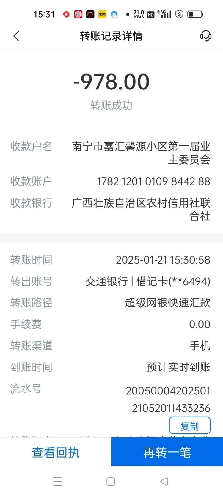 ★(十)2025年1月21日,确认净水机运营商转入2024年水电费,公共收益收入¥978.00元