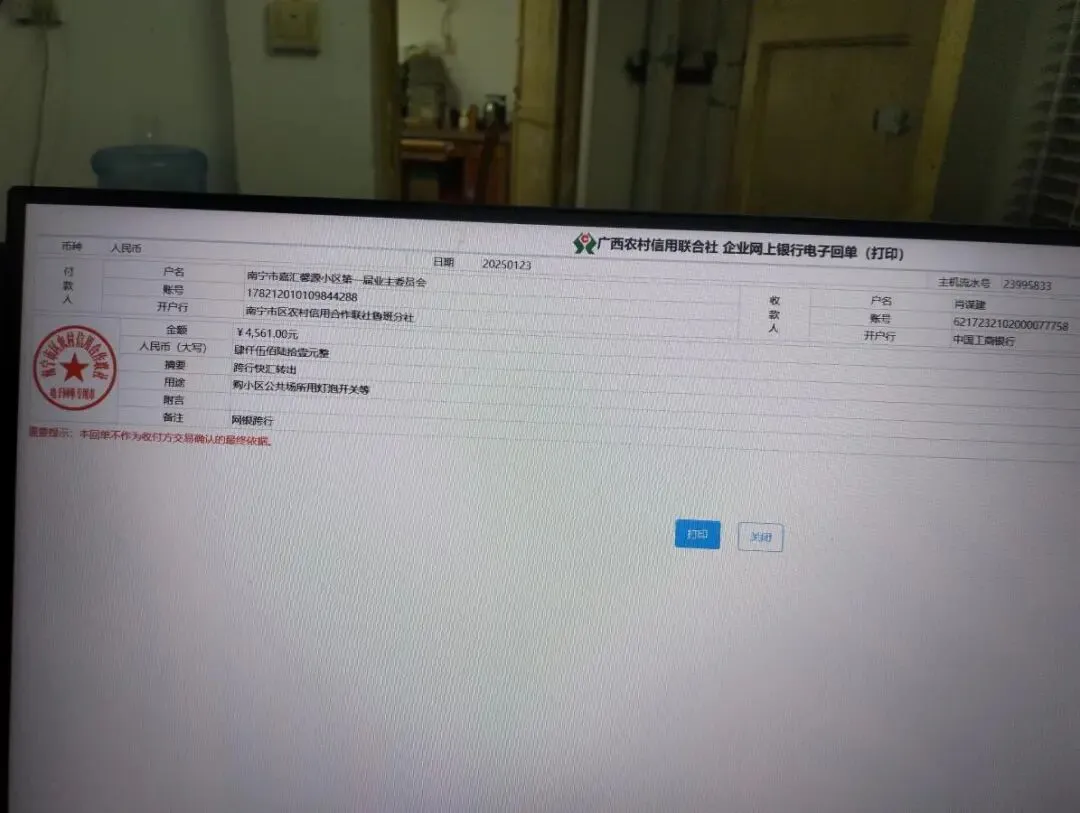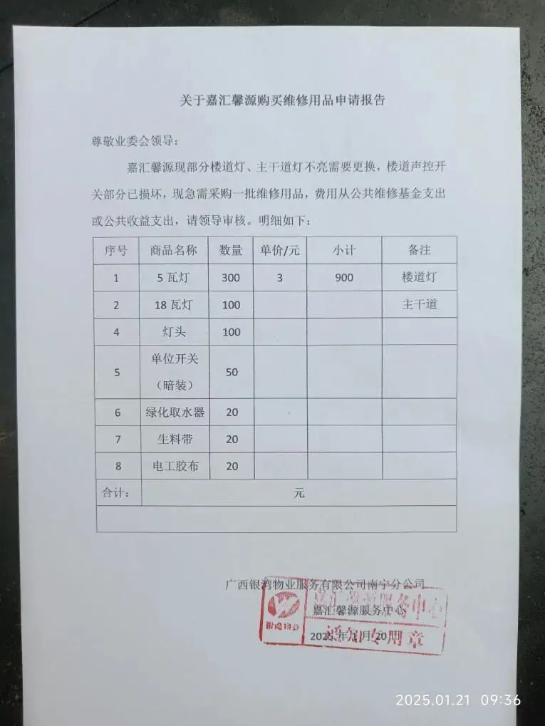 ☆(十一)2025年1月23日,审核物业提交的关于购买灯泡、灯座、开关、取水器等绿化和照明用品申请报告(业委65%、物业35%),公共收益支出¥4561.00元