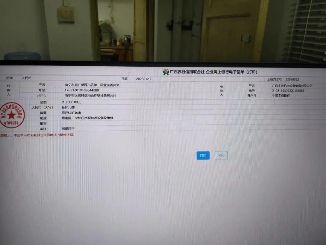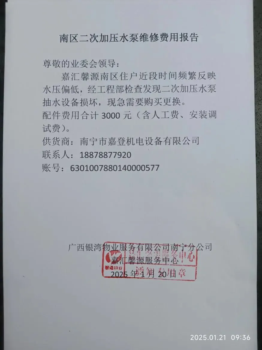 ☆(十二)2025年1月23日,审核物业提交的关于更换南区二次供水加压水泵申请报告,公共收益支出相关费用¥3000.00元