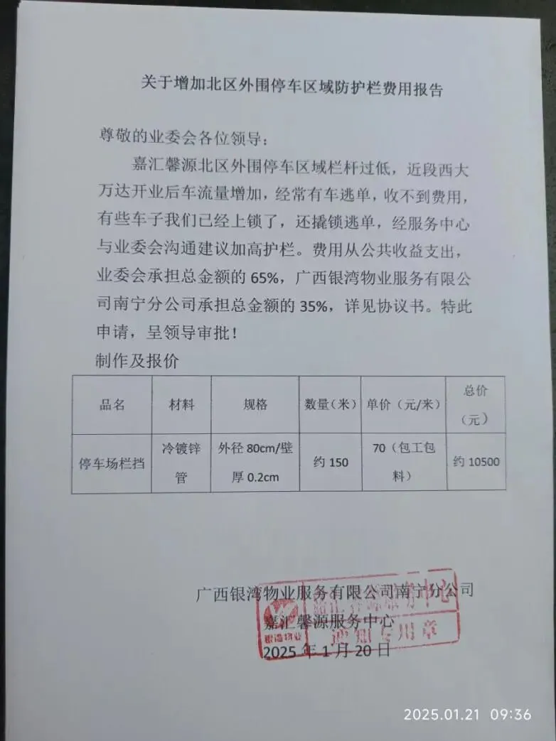 ☆(十四)2025年1月25日,审核物业提交的关于制作安装北区外围停车场拦挡申请报告,公共收益支出相关费用¥10640.00元。