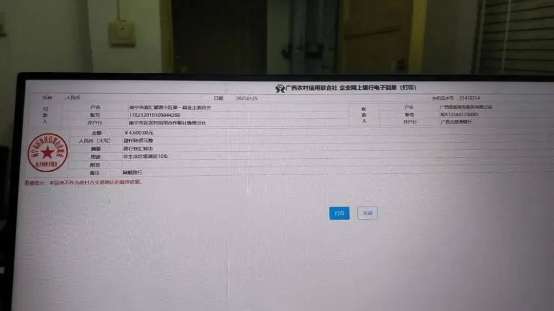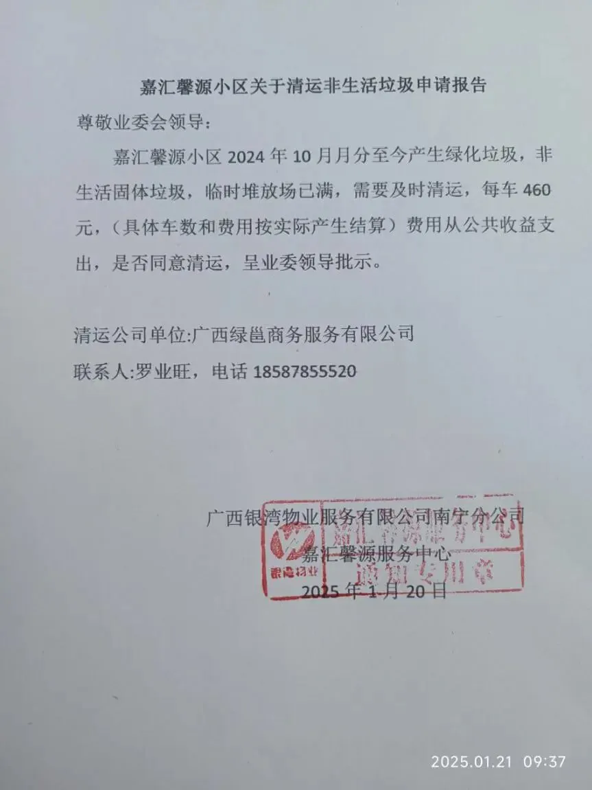 ☆(十五)2025年1月25日,审核物业提交的关于清运非生活垃圾申请报告,公共收益支出相关费用¥4600.00元。
