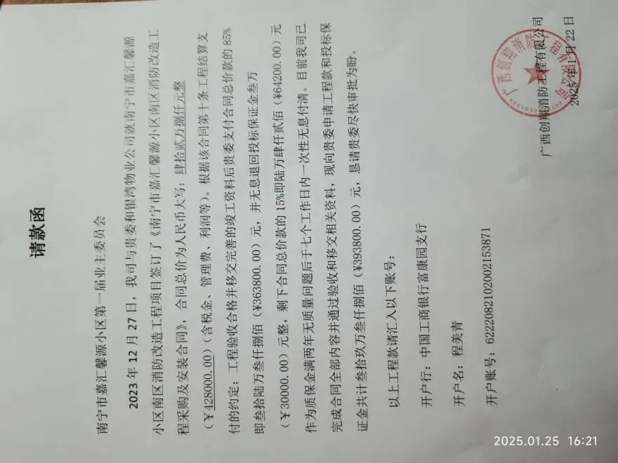 ☆(十六)2025年1月25日,审核南区消防改造工程承包方提交的关于结算85%合同款和退回履约保证金的请款函,公共收益支出相关费用¥3938000.00元。