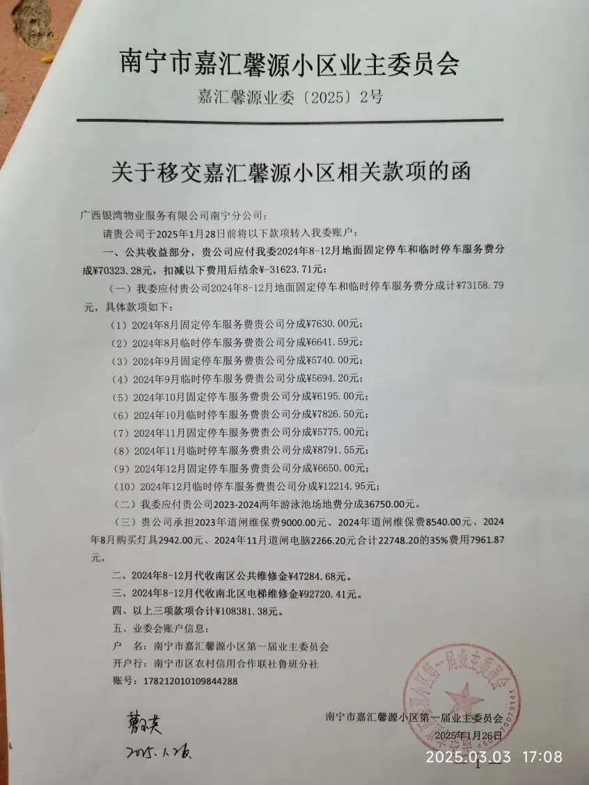 ★(十七)2025年2月24日,发函物业要求移交2024年8-12月份公共收益结算款项以及代收的电梯维修金和房屋维修金合计¥108381.38元。