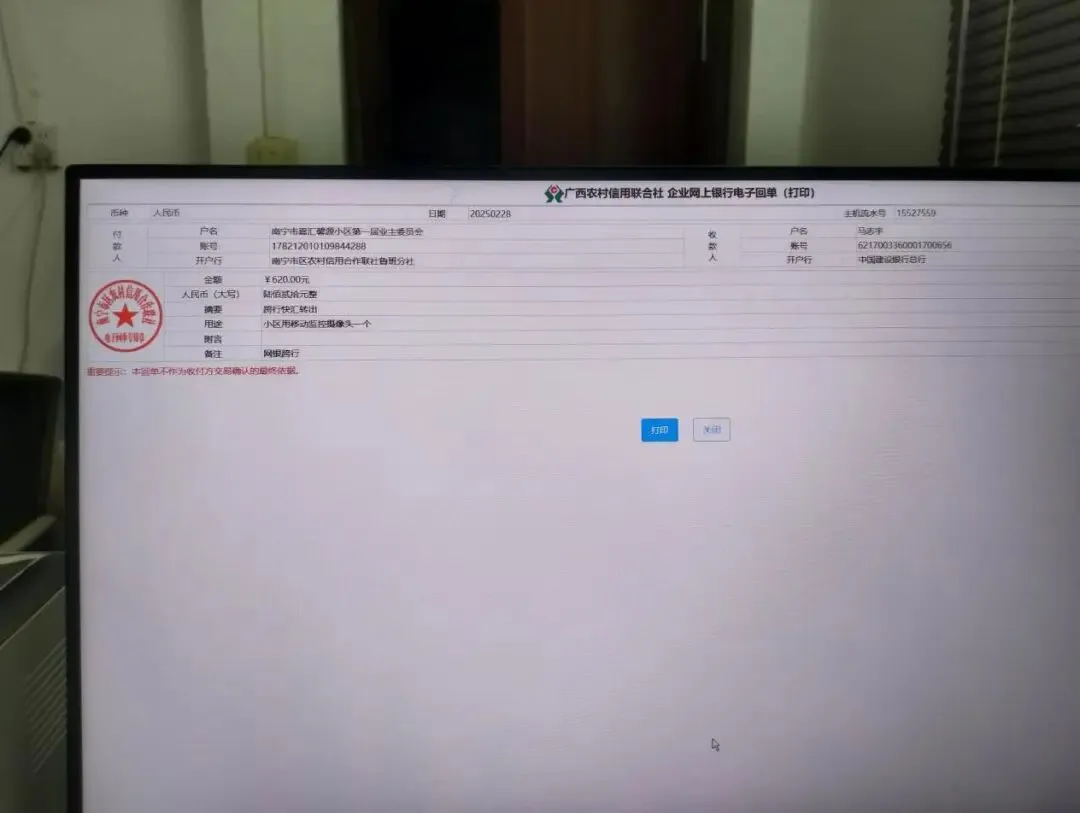 ☆(十九)2025年2月28日,转出移动监控摄像机一台货款,公共收益支出相关费用¥620.00元。