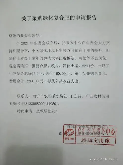 ☆(二十一)2025年3月7日,审核物业提交的《关于采购绿化复合肥的申请报告》,购买小区绿化用复合肥8包(每包80千克),公共收益支出相关费用¥1280.00元。