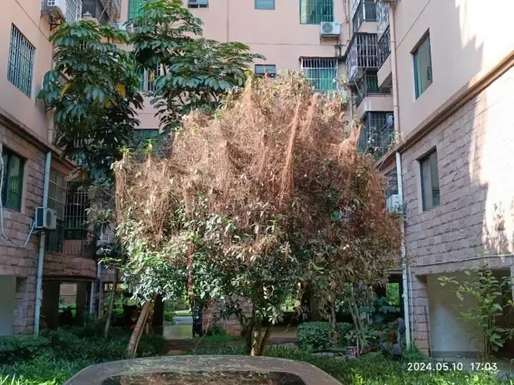 (一)小区很多绿植被无根藤缠绕,长期不处置会枯萎甚至死亡,督促物业不定期修剪以抑制无根藤的泛滥。
