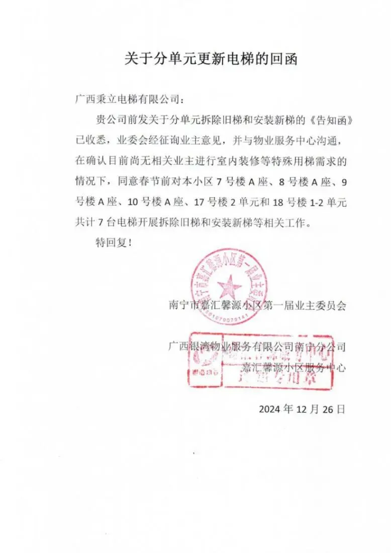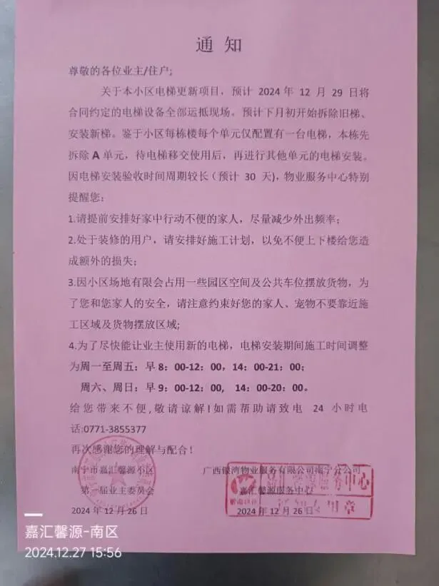 (一)2024年12月27日,协调电梯代理商,配合物业排查电梯楼业主特殊用梯需求,做好分单元拆装电梯的回函和通知业主工作。