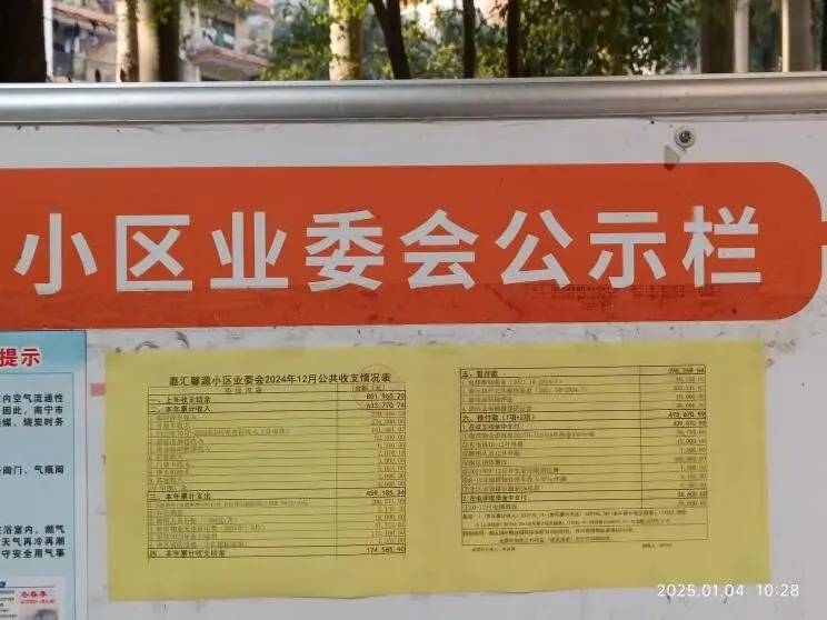 (五)2025年1月4日,按有关规定对2024年下半年以来小区公共收支情况进行半年一次的公示张贴,相关信息同步转发到14个业主微信群。