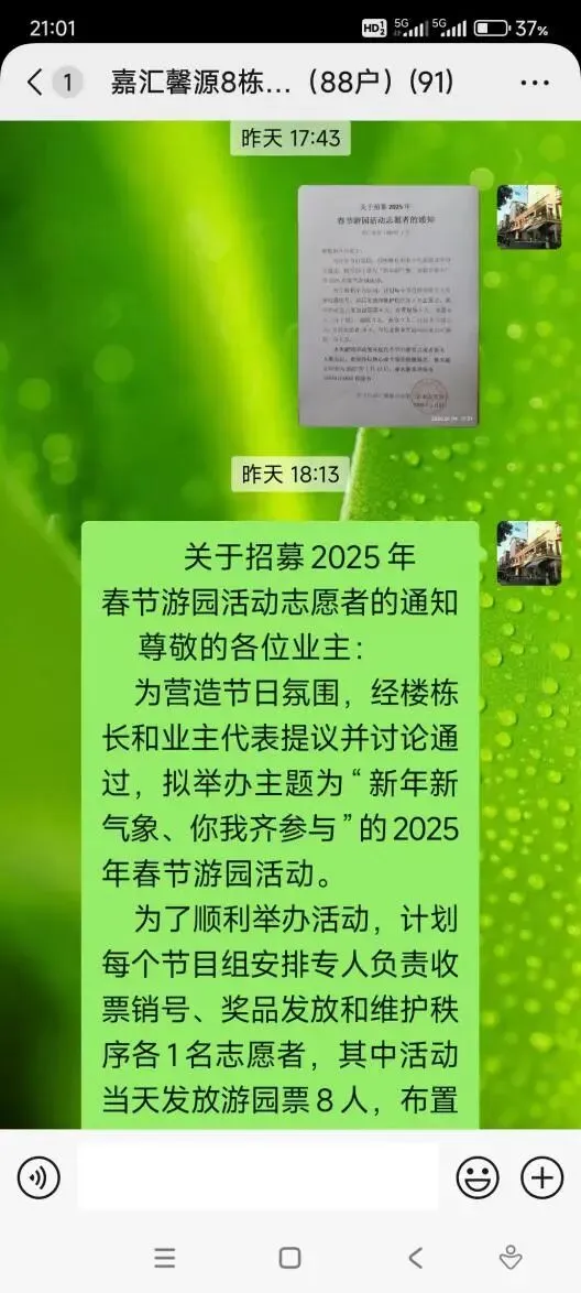(六)2025年1月9日,四个公示栏张贴《关于招募2025年春节游园活动志愿者的通知》,相关信息同步转发到14个业主微信群。