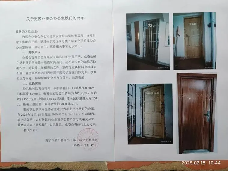 (五)2025年2月28日,更换业委会办公室三扇破旧木门为钢制防盗门。