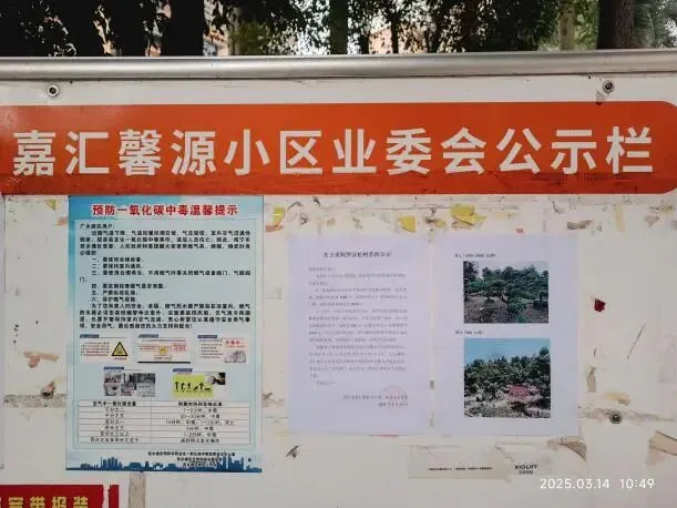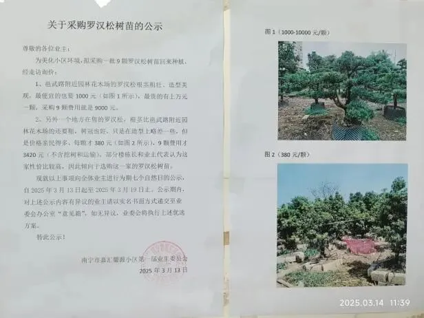 (二十)2025年3月13日,四个公示栏张贴《关于采购罗汉松树苗的公示》,相关信息同步转发到14个业主微信群。