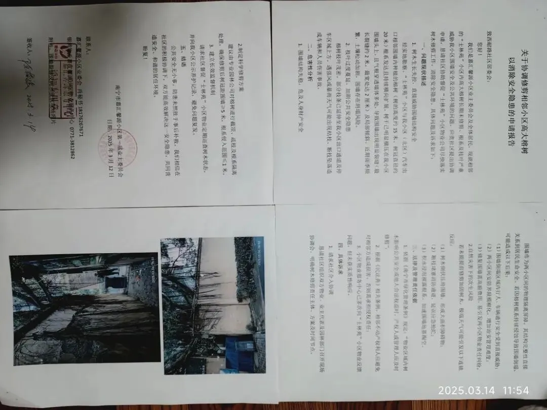 (二十一)2025年3月13日,向西耐路社区递交《关于协调修剪相邻小区高大榕树以消除安全隐患的申请报告》。