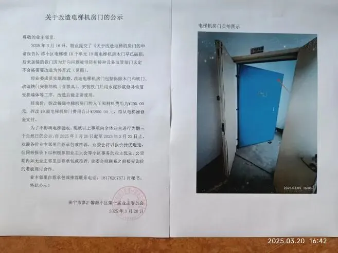 (二十二)2025年3月20日,四个公示栏张贴《关于改造电梯机房门的公示》,相关信息同步转发到14个业主微信群。