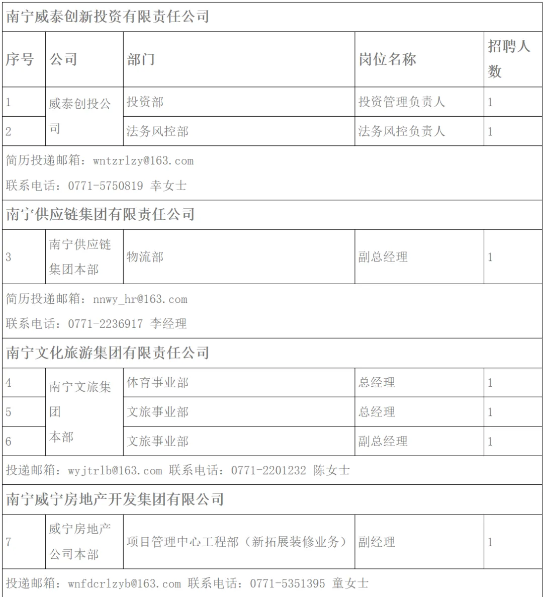 本次招聘采取网上报名方式,报名截止时间为2026年3月27日,具体岗位要求、简历投递邮箱、联系电话详见附件1,符合条件的人选请下载《南宁威宁集团应聘登记表》(附件2)填写发送相应邮箱,邮件主题及应聘登记表命名为“应聘公司+岗位名称+姓名”,并选择邮件回执。未尽事宜请联系幸女士,联系电话:0771-5750819。每位应聘者仅能选择一个职位投递简历,请勿重复投递。