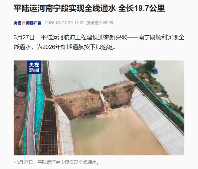 3月27日上午9时18分,平陆运河南宁段实现全线通水,为2026年如期通航按下关键加速键。
