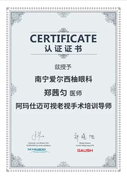 2026年3月31日,南宁爱尔西柚眼科郑茜匀院长获颁全国首批“十全视美”迈可视老视矫正手术认证专家称号。
